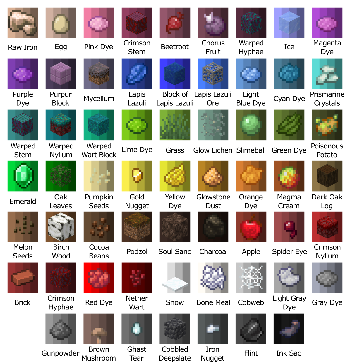 Next, you’ll need dyes. These are different from vanilla dyes as there are 61 colours you can paint with. Each colour can be made lighter once and darker twice, resulting in 4 shades per colour. Below are all the dye blocks and their colours