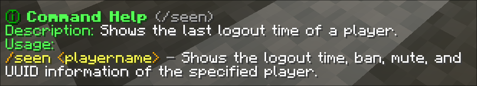 [command:seen <username>]Shows players last logout time.